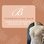 [vc_row css_animation="" row_type="row" use_row_as_full_screen_section="no" type="full_width" angled_section="no" text_align="left" background_image_as_pattern="without_pattern"][vc_column][vc_column_text css=""] Blue Sky Bridal is hosting a Thanksgiving Sale! We have so much to be thankful for here at...