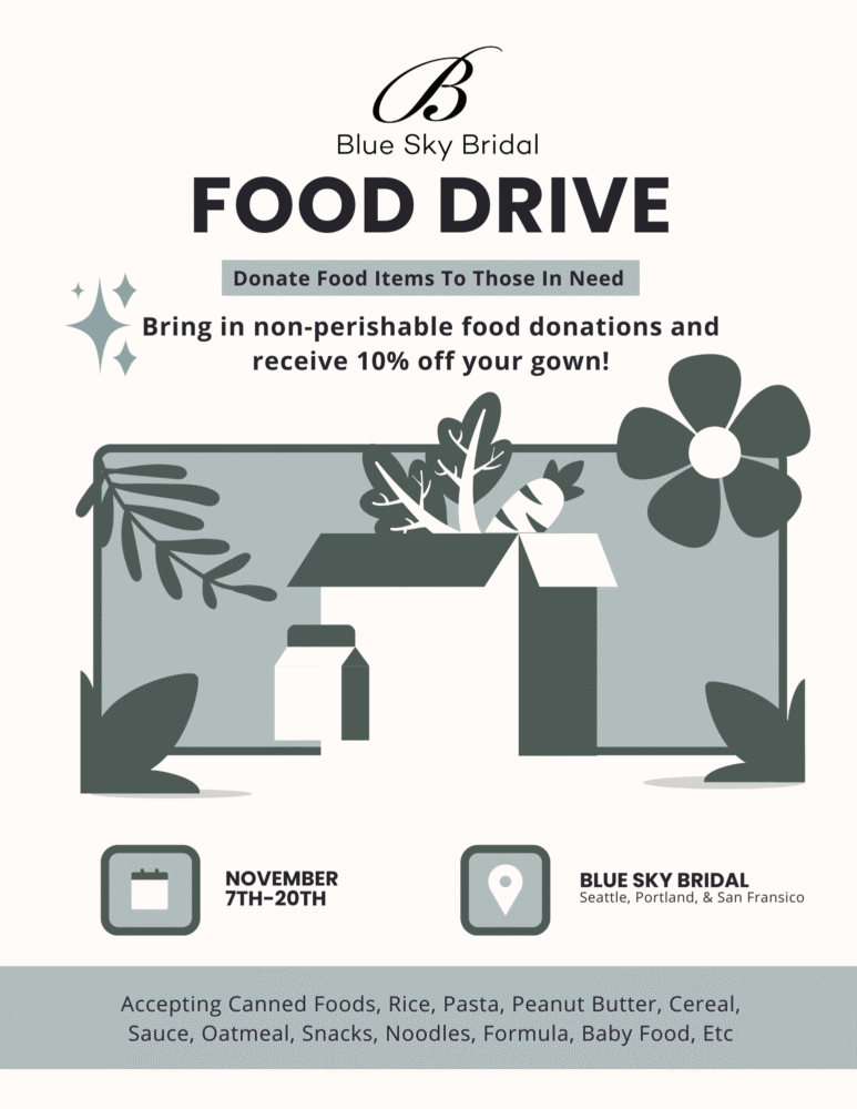 At Blue Sky Bridal, we were founded to support local brides, our community, and the planet through consignment. Today, we’re continuing that mission by collecting non-perishable...